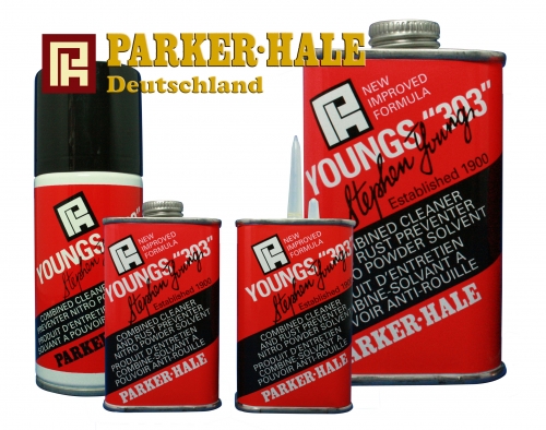Youngs 303 ist in Großbritannien der bekannteste und am weitesten verbreitete Reiniger und Rostinhibitor für Gewehrläufe sowie für andere Metallteile. Youngs 303 emulgiert mit Wasser und kann deshalb auch verdünnt angewendet werden. Als Solvent löst Young's 303 Pulverrückstände, Schmutz und andere Ablagerungen im Lauf, die danach mit den mechanischen Reinigungsmitteln von Parker Hale aus dem Lauf gewischt werden können. Auch für diese Zwecke finden Sie hier. Youngs 303 besitzt die Fähigkeit mit Wasser zu emulgieren. Eine so hergestellte Emulsion im Verhältnis von einem Teil Young's 303 und drei Teilen Wasser wird Aquoil * genannt. So ist es möglich, erstens sparsam und zweitens auf die jeweilige Reinigungsaufgabe zugeschnitten, ein geeignetes Gemisch von Young's 303 und Wasserverwenden.